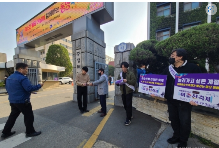 On this day, Asan city officials organized into four groups and asked public officials on their way to work to wear promotional shoulder straps at the main entrance of the building and distribute festival promotional flyers to promote Asan, the city of Yi Sun-sin, and ask them to join the newly changed Yi Festival.