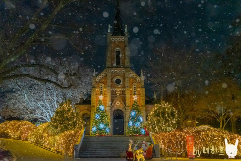 안녕하세요! 오늘은 아산에 위치한 공세리 성당의 크리스마스 시즌을 소개해 드릴게요. 이곳은 매년 크리스마스가 되면 화려한 조명과 장식으로 가득 차서 많은 사람들의 사랑을 받는 명소예요. 그럼, 함께 이 아름다운 성당을 탐방해 볼까요?