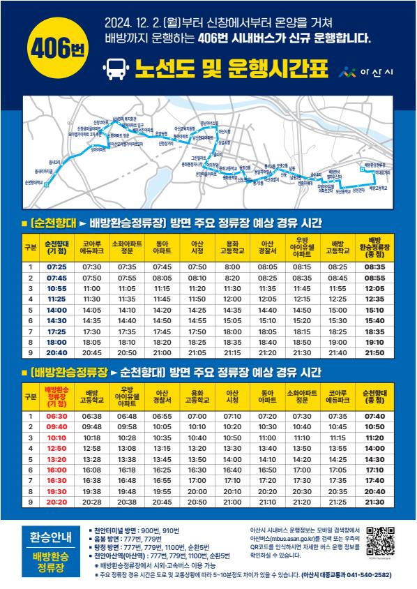 First, I'll talk about Asan City's transportation. There is a new bus route 406 that will be operating from December 2. This bus connects Sinchang to Baebang, and major stops include Goeun, Sochon, and Donga.